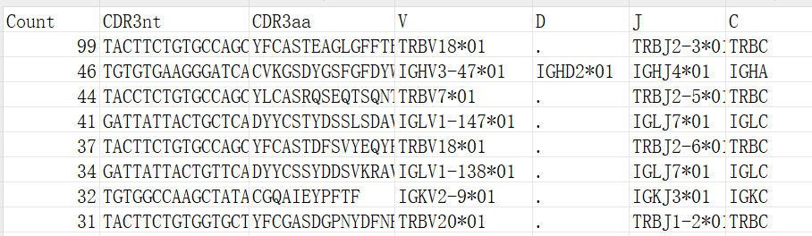 File content: Files must contain at least the following columns: clone count (Count), amino acid sequence (CDR3Aa), nucleotide sequence (CDR3nt), V, J, C. If conducting group comparisons, it is recommended to have a minimum of 2 samples per group.